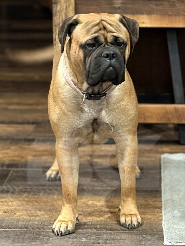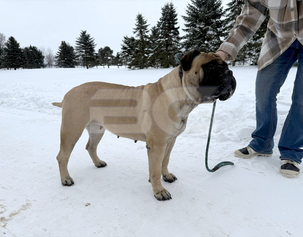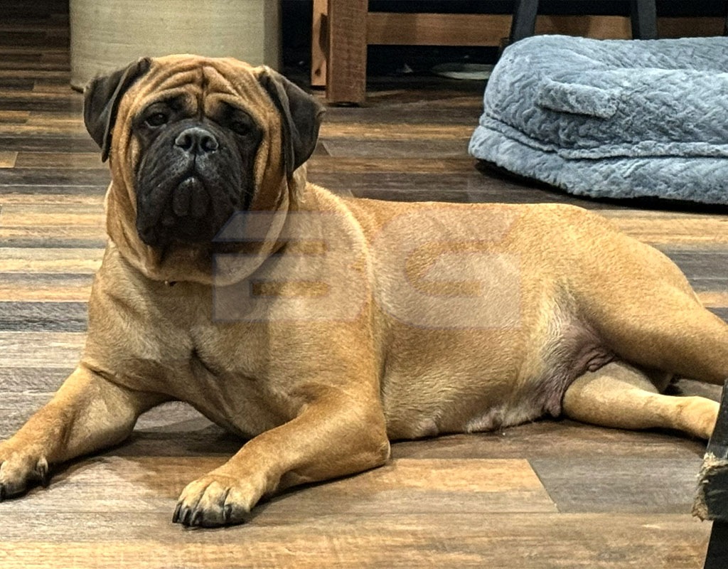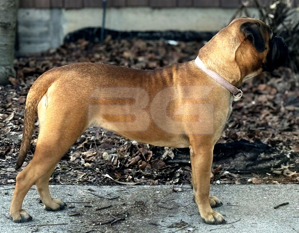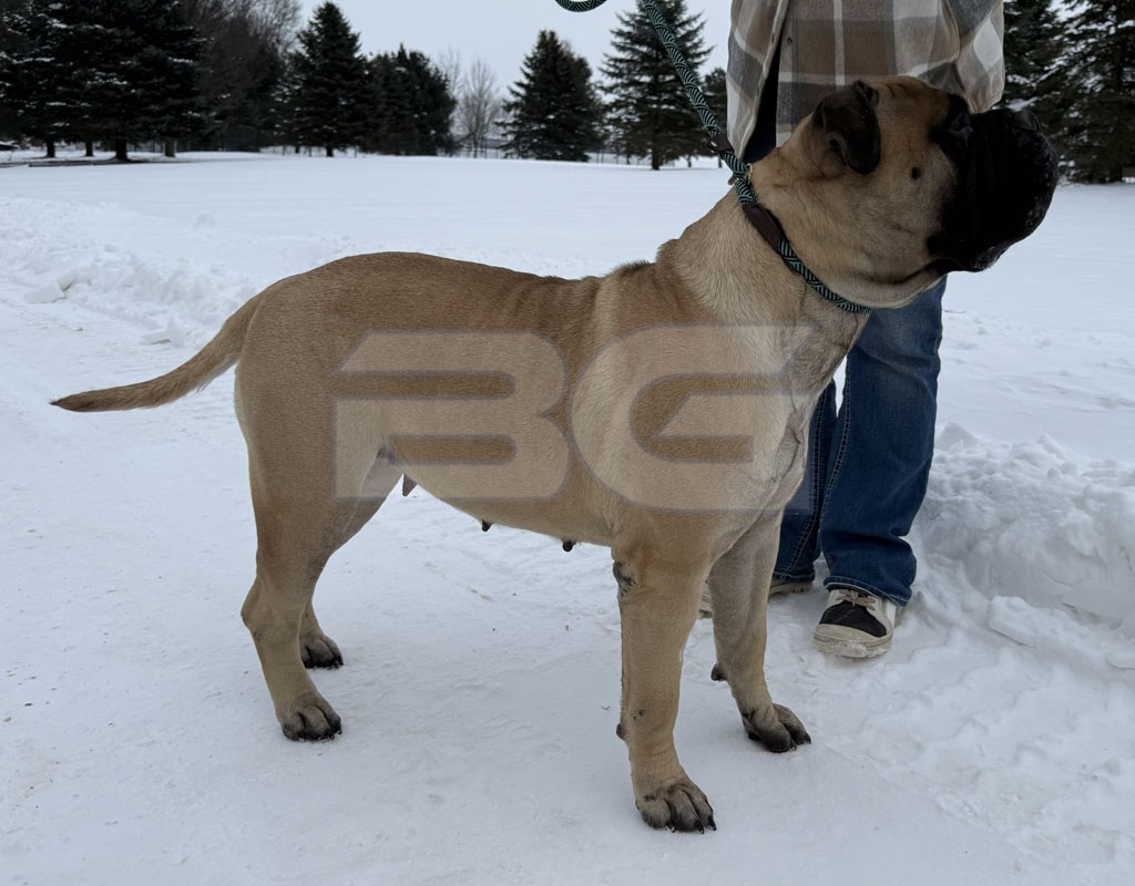 Raya has a fantastic pedigree for looks and temperament. She is our youngest female that was born and raised here at BG BULLMASTIFFS. Her temperament reflects the gentle nature of both her parents, Nala and Rugar. We also see that our love and care that we provide from day one is very evident in her laid back nature.